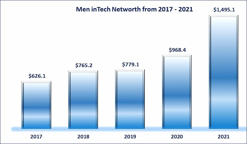 Of this amount, the value of the male billionaires in tech alone is $1.5tr while that of women in tech alone is $100b.