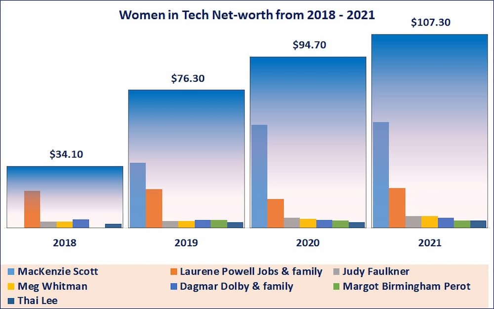 From 2018 to 2021, Techuncode observes that the women billionaires in tech improved significantly in their net worths.