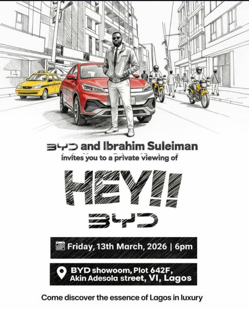 The occasion was the debut of Hey BYD, an in-transit podcast hosted by actor Ibrahim Suleiman, recorded inside a BYD electric vehicle moving through Lagos traffic. The concept is simple but hard to replicate: no studio, no controlled environment, just people in a moving car with Lagos doing what Lagos does outside the window.