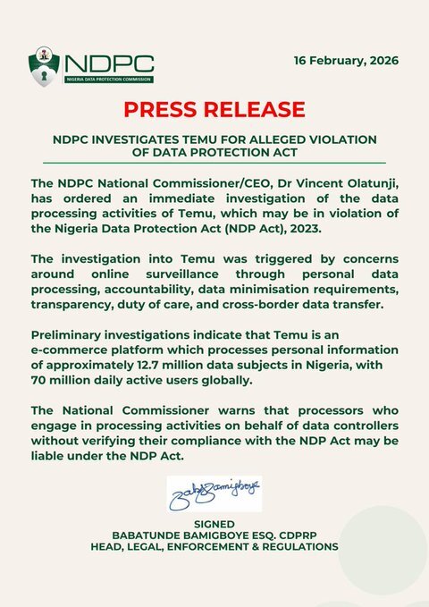 An official memo from the Nigeria Data Protection Commission (NDPC) confirms that the investigation focuses on how Temu collects, processes, and transfers Nigerian users’ personal data under the Nigeria Data Protection Act (NDPA) 2023. The commission raised concerns about transparency, cross-border data handling, and platform accountability. The tone of the memo signals a more assertive phase of enforcement, one that extends beyond routine compliance checks.